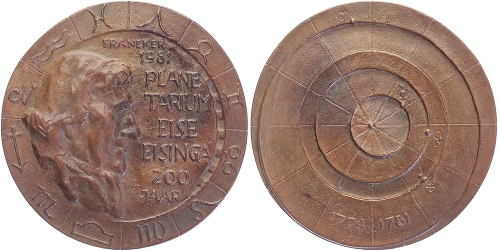 1981 Franeker, 200 jaar Eise Eisinga Planetarium. Buste Eisinga naar rechts binnen zodiak. / Planetenstand voorjaar 1774. Æ gegoten 81. Tilanus 30. Guus Hellegers. Prachtig.