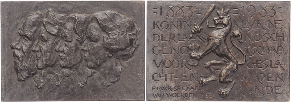 1983 Eeuwfeest Koninklijk Nederlandsch Genootschap voor Geslacht- en Wapenkunde. Hoofden Willem III, Wilhelmina, Juliana en Beatrix naar links. / Nederlandse leeuw en opschrift. Æ gegoten 51 x 77. E.L.W.R. Baron Speyart van Woerden. Prachtig.