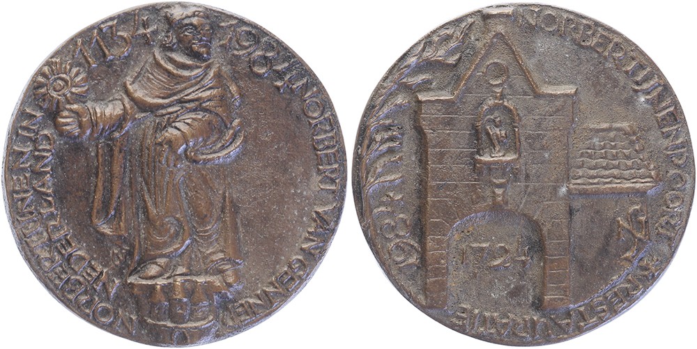 1984 Tilburg, 850e sterfdag St. Norbertus. Staande Norbertus met wapen van Tilburg. / De Norbertijnenpoort te Tilburg. Æ gegoten 64,5. Van der kam P8403. Niel Steenbergen. Prachtig.