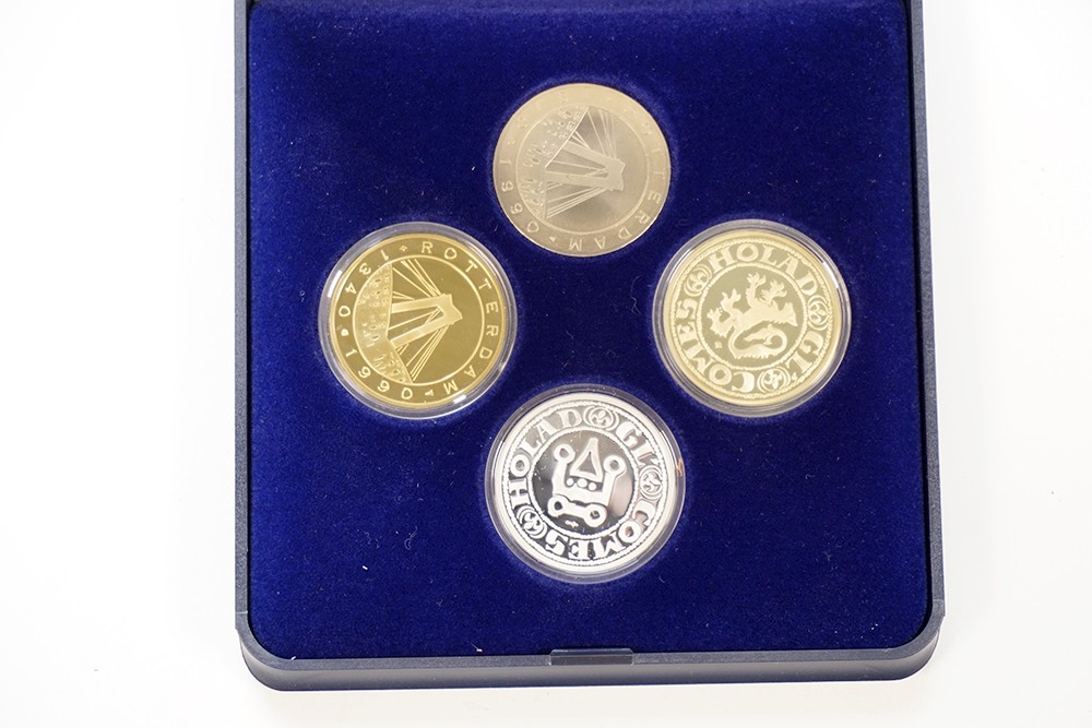 1990 Rotterdam 650 jaar. Complete (4) ‘Porterset’ inclusief goud en zilver. In originele cassette ’s Rijks Munt. FDC en proof.