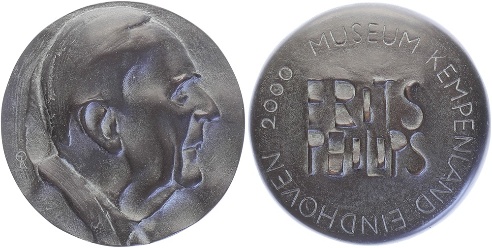 2000 Eindhoven, Dr. Ir. Frits Philips 95 Jaar. Hoofd naar rechts. / Zijn naam in twee regels met als omschrift Museum Kempenland Eindhoven 2000. Æ 98 gegoten. Jos Reniers. Prachtig.