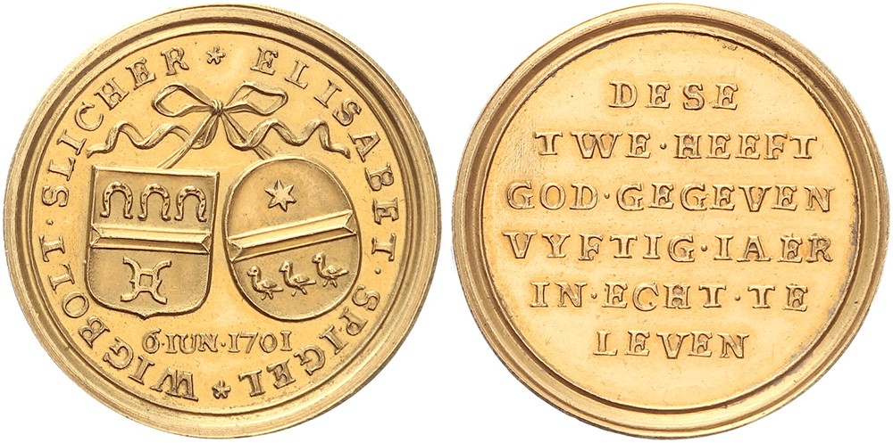 1701 Gouden huwelijk Wigbolt Slicher & Elisabet Spigel. Familiewapens, door lint verbonden, boven jubileumdatum. / Zesregelig opschrift: DESE TWE • HEEFT GOD • GEGEVEN VYFTIG • IAER IN • ECHT • TE LEVEN AU 24 [8,57 gr.]. DPR II-2652; KPK 1967; Bemolt 604. Zeer zeldzaam. Ruim prachtig. N.B. Ex veiling 6 Laurens Schulman, april 1991, kavel 1023