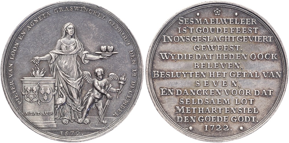1722 Gouden huwelijk Pieter van Loon en Agneta Graswinckel. Staande Dankbaarheid met dienblad offert aan brandend altaar waarop twee familiewapens. Putto met brandende fakkel en passer. / Dertienregelig gedicht. AR 44,9 [31,06 gr.]. VvL 71; KPK 2418; Bemolt 773. Prachtig.
