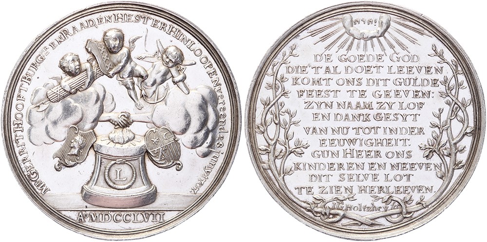 1757 Amsterdam. Zilveren huwelijk Mr. Gerrit Hooft, burgemeester & Hester Hinloopen. Drie zwevende genii boven brandend altaar geflankeerd door familiewapens. / Twaalfregelig gedicht binnen gekruiste takken en onder Jehovah. AR 48,7 [38,26 gr.]. J.G. Holtzhey. DPR III-1313; KPK 3023; Bemolt 1129. Prachtig.