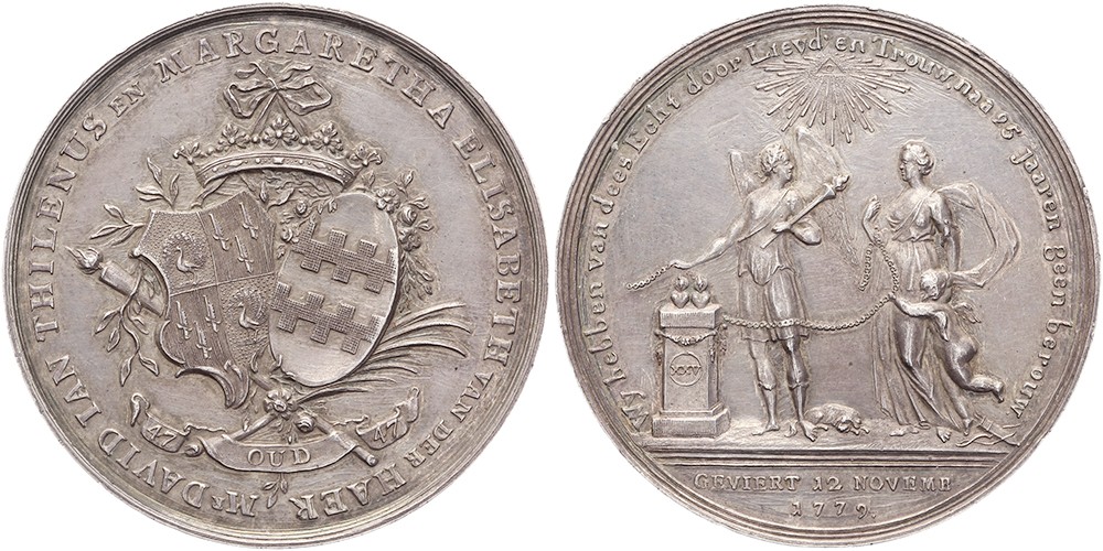 1779 Zilveren huwelijk Mr. David Jan Thilenus & Margaretha Elisabeth van der Haer. Twee familiewapens onder kroon. / Staande engel met toorts bij altaar met vlammende harten; staande vrouw met cherubijn. AR 45,2 [29,84 gr.]. KPK 3354; Bemolt 1347. (J.G. Holtzhey). Zeer fraai.