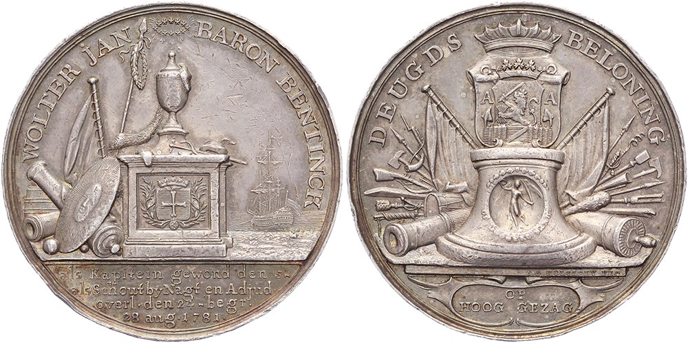 1781 Dood Wolter Jan Baron Bentinck, schout-bij-nacht en adjudant van prins Willem IV. Urn op altaar omgeven door kanonnen en medusaschild. Zeilschip op de achtergrond. / Familiewapen boven voetstuk omgeven door vaandels en divers schiettuig. AR 45 [29,58 gr.]. VvL 565; KPK 3380; Bemolt 1367. (J.G. Holtzhey). Krom, randbeschadigingen en geboord gat in rand. Toch nog zeer fraai.