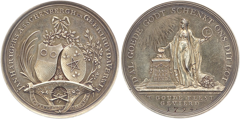 1794 Gouden huwelijk Jan Hartgers Asschenberg & Geertruida Verwit. Twee versierde familiewapens. / Staande vrouw bij brandend altaar beschenen door hemellicht. In haar linkerhand een slangenrond, waarin het cijfer ‘L’, hooghoudend. Jaartal gegraveerd in afsnede. AR 42,5 [25,02 gr.]. JMP 1971/72, pag. 138; Bemolt 1498. J.G. Holtzhey. Licht verguld. Prachtig.