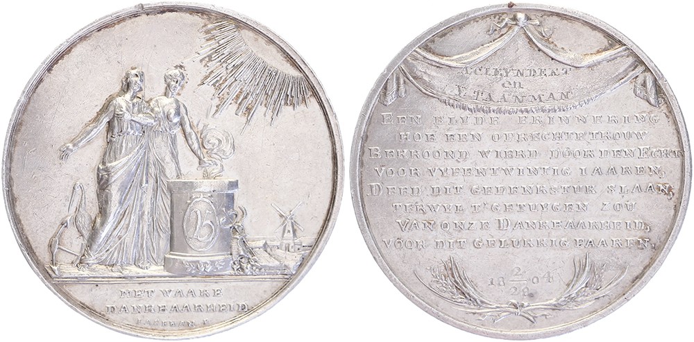 1804 Zilveren huwelijk A. Cleyndert & Y. Taanman. Staand bruidspaar bij brandend altaar. / Achtregelig gedicht onder gedrapeerd doek met inscriptie. AR 44,7. J.M. Lageman. Schaarse familiepenning. J.M. Lageman. Bemolt 1554. Tikjes rand. Vrijwel prachtig.