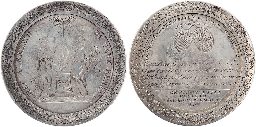 1807 Zilveren huwelijk L. van der Schoor & vrouwe G. Mauritz. Staand echtpaar bij brandend altaar waarop XXV. / Twee familiewapens en tekst. AR 57,4 [49,59 gr.], geheel gegraveerd. DPR —; Nahuys —; Bemolt 1572. Uiterst zeldzaam. Prachtig. N.B. Ex veiling 8 Laurens Schulman, april 1992, kavel 1529 > veiling 237 Jacques Schulman, maart 1963, kavel 1283a
