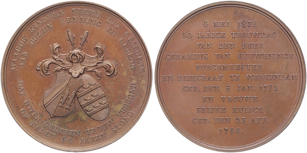 1836 Werkendam. Gouden huwelijk burgemeester en dijkgraaf G. van Houweninge & vrouwe S. Kuijck. Twee familiewapens onder toernooihelm. / Elfregelig opschrift. Æ 41,6. Dirks 518. Prachtig. N.B. Ex veiling 18 Laurens Schulman, april 1997, kavel 1357