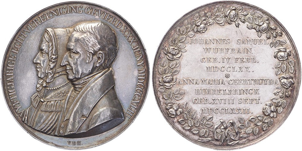 1843 Gouden huwelijk Joh. Sam. Wurfbain & A.M.G. Hurrelbrinck. Dubbelportret naar links. / Achtregelig opschrift in krans van rozen. AR 44,6 [25,97 gr.]. Dirks 616*. Van der Kellen. Flauw tikje rand voorzijde. Prachtig.