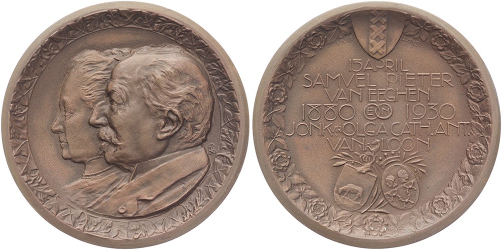 1930 Amsterdam. Gouden huwelijk Samuel Pieter van Eeghen & Jkvr. Olga Catharina Antonia van Loon. Dubbelportret naar links. / Zesregelig opschrift tussen stads- en familiewapens. Æ 42,4. KB III-390. Huib Luns. Prachtig.