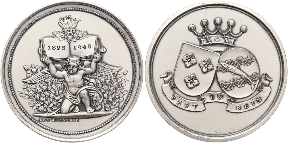 1948 Gouden huwelijk Jhr. Mr. Cornelis Beelaerts van Blokland & Margaretha Elisabeth Maria Havelaar. Gehurkte cupido houdt opengeslagen boek met jubileumdata hoog. / Familiewapens onder jonkeer kroon. AR 50,2 [62,55 gr.]. J.P.M. Menger. Vrijwel FDC. N.B. Vervaardigd bij ’s Rijks Munt. Ex veiling 18 Laurens Schulman, april 1997, kavel 1369. Cornelis Beelaerts van Blokland was o.m. bestuurslid van het Kon. Genootschap voor Munt- en Penningkunde.