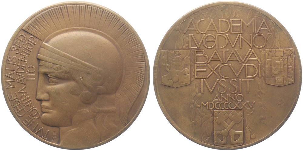 1925 Leiden, 350 jaar universiteit. Minervahoofd naar links. / Zevenregelig opschrift tussen wapens van Leiden, Nederland en Oranje. Æ 60. KB II-492; JP 133; Hofstee 110. Prachtig.