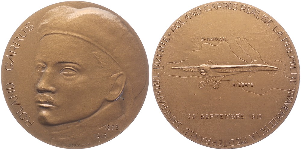 1978 Roland Garros réalisé la première traversée de la Méditerranée. Tête Garros à gauche. / Avion sur vol de St. Raphael à Bizerte en 1913. Æ 68. J. Normand. Supberbe.