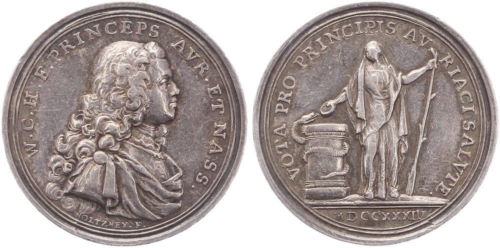 1734 Op de genezing prins Willem IV. Borstbeeld Willem naar rechts. / Offerende Hygiea bij zuil met slang. AR 29 [7,94 gr.]. VvL 85; Brettauer 4640. M. Holtzhey. Zeer fraai.