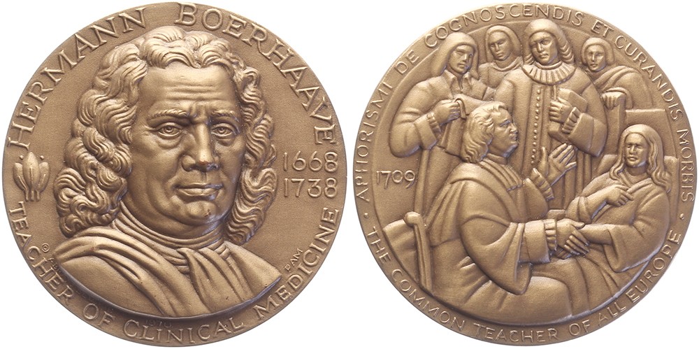 1970 Hermann Boerhaave 1668-1738. Buste Herman bijna en face. / Boerhaave met viertal leerlingen aan bed. Æ 44,4. Hofstee 15. Abr. Belskie. FDC.