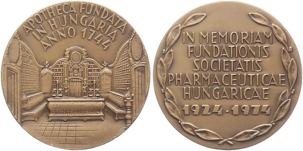 1974 In memoriam fundation Societas Pharmaceuticae Hungaricae 1924-1974. Interieur grote apotheek. / Zesregelig opschrift. Æ 60. Klein tikje rand vz. Prachtig.