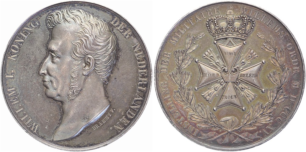 1815 Instelling militaire Willems Orde. Portret koning Willem I naar links. / De Willemsorde. AR 45,8 [51,32 gr.]. Bramsen 1750; JMP 1932, pag. 5/6, nr. 3; Dirks 40. J.P. Braemt. Zeldzaam in zilver. Patina. Prachtig. N.B. Ex veiling 293 Robert Schulman, mei 1992, kavel 933 (ex lot)