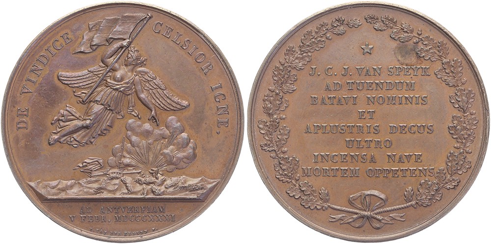 1831 Heldendood J.C.J. van Speijk. Ontploffende kanonneerboot Nº 2 onder vliegende Genius met Nederlandse vlag. / Achtregelig opschrift binnen gestrikte eikentakken. Æ 46. Dirks 401; JMP 1932, pag. 90, nr. 123. D. van der Kellen. Prachtig.