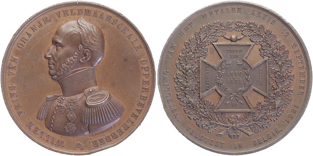 1831 Instelling van het Metalen Kruis. Borstbeeld koning Willem II in uniform van veldmaarschalk naar links. / Het kruis in dikke eikenkrans. Æ 65,5. Dirks 446; JMP 1932, pag. 39, nr. 42. J.P. Schouberg. Randbeschadigingen, anders zeer fraai. N.B. Vervaardigd bij ’s Rijks Munt in 1861.