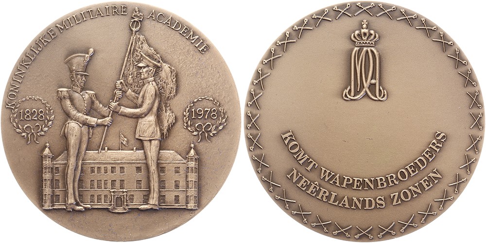1978 Breda, 150 jaar Kon. Militaire Academie. Overdracht standaard door cadet uit 1828 aan cadet uit 1978. / Gekroond monogram en leuze. Æ 60,2. KB VII-4133. Eric van den Boom. Prachtig.