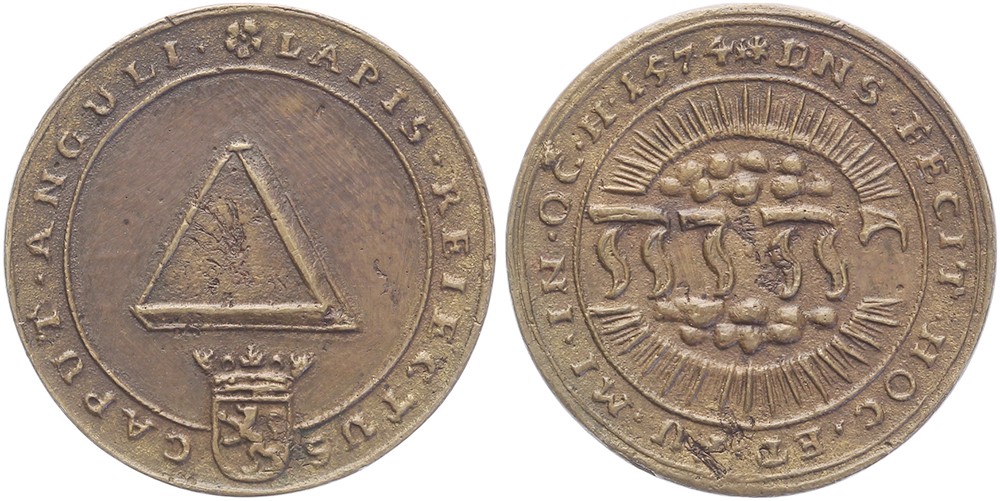 1574 Godsdienstvrijheid in Holland & Zeeland. Driehoekige steen. / Het Hebreeuwse woord Jehovah. Messing gegoten 28,8 en vrij dik [10,15 gr.]. Dugn. 2630; vL I-203.1; Tas 117. Zeer fraai.