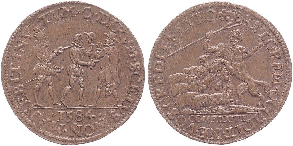 1584 Moord op Willem van Oranje te Delft. Philips II moedigt Balthasar Gérards aan, die de prins neerschiet, terwijl hij hem groet. / Herder met kudde schapen wordt vermoord. Æ 30,3. Dugn. 2995; vL I-344; Tas 208. Prachtig.