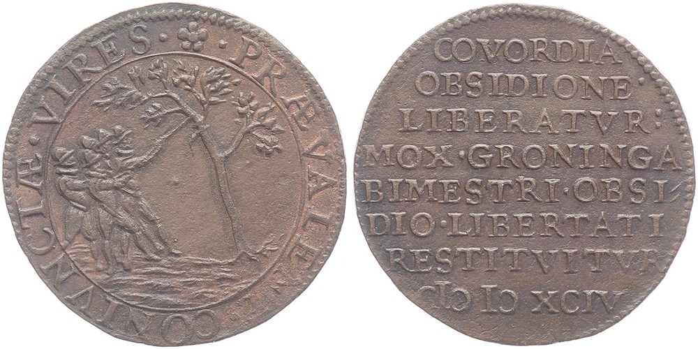 1594 Bevrijding van Coevorden en herinname van Groningen. Vijf mannen trekken boom om. / Achtregelig opschrift. Æ 29. Dugn. 3338; vL I-448.4; Tas 292. Prachtig.