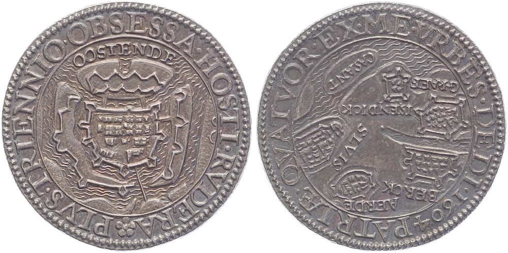 1604 Capitulatie van Oostende aan Albert & Isabelle. De vestingstad Oostende. / Plattegrond Rijnbende, Grave, Sluis, Aardenburg en schans IJzendijk. AR 30 [7,11 gr.]. Dugn. 3585; vL II-15.5; Tas 377. Patina. Prachtig / FDC. N.B. Ex veiling 25 Laurens Schulman, april 2011, kavel 2789