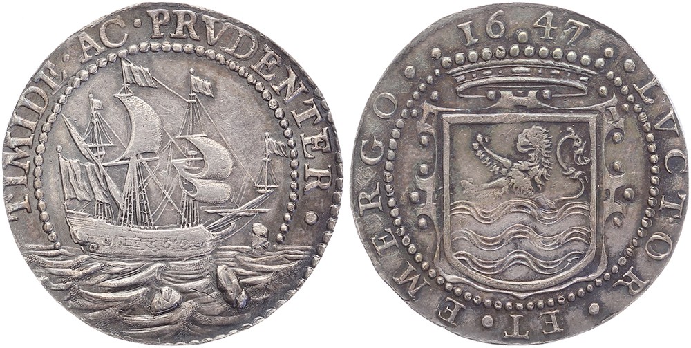 1647 Zeeland, vredesonderhandelingen te Münster. Oorlogsschip met volle zeilen. / Gekroond Zeeuws wapenschild in cartouche. AR 30,5 [7,31 gr.]. Dugn. 4010; vL II-306; Pax 89; Tas 533bis. Ruim zeer fraai. N.B. Ex veiling 16 Laurens Schulman, april 1996, kavel 1653