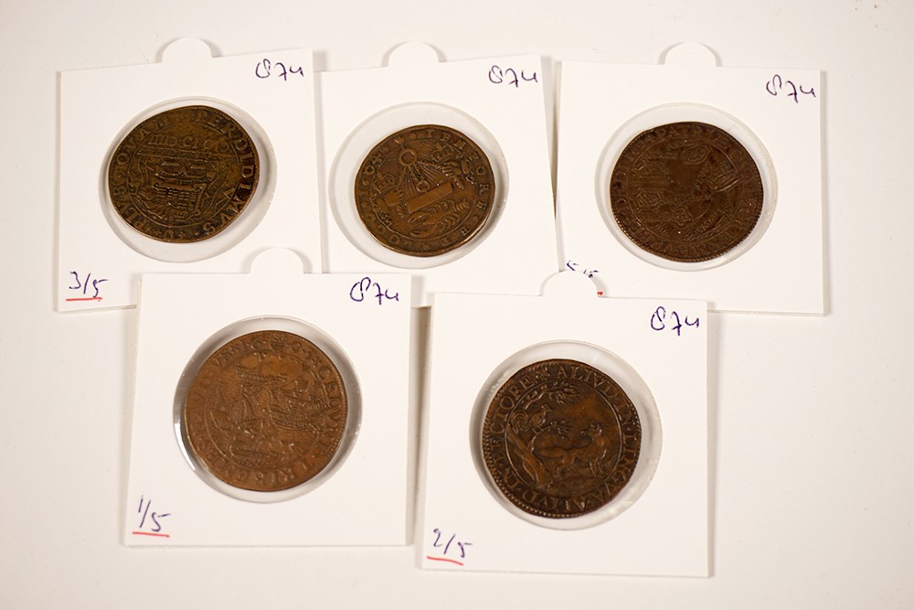 Lot (5) 1603 Overwinning op Spinola [D. 3551]; 1603 Geveinsde vergiffenis aartshertogen [D. 3559]; 1604 Langdurig beleg Oostende door Spinola [D. 3558, Tas 370!]; 1604 Inname Sluis [D. 3584]; 1604 Capitulatie Oostende [D. 3585]. Æ, gemiddeld zeer fraai.
