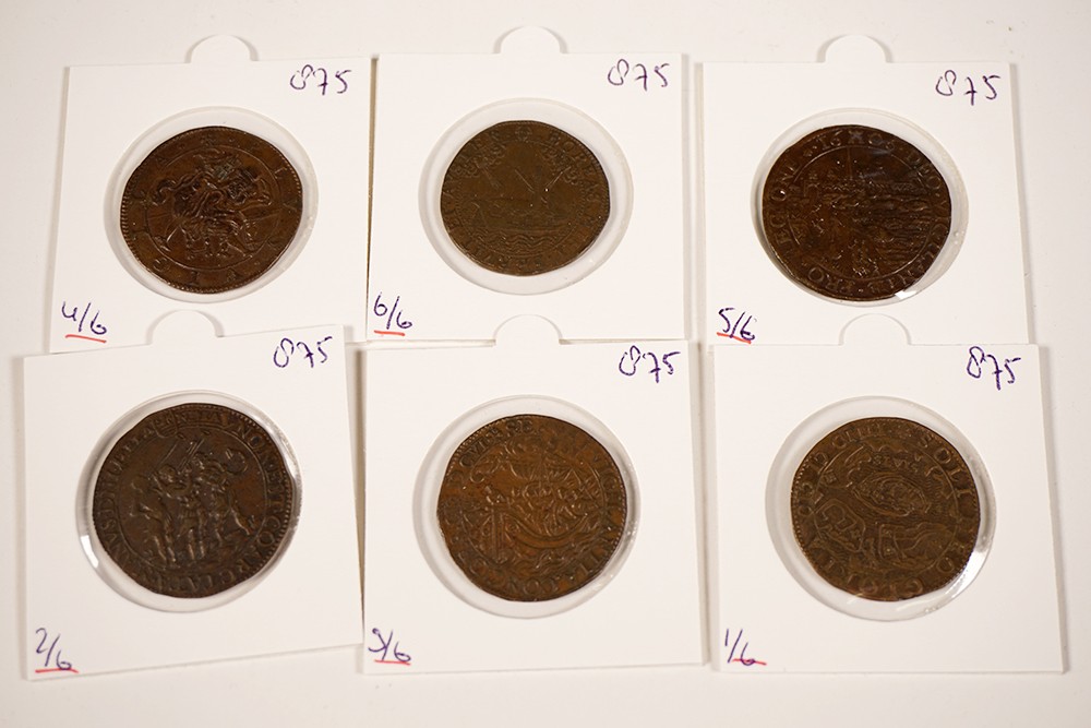 Lot (6) 1604 Inname Sluis [D. 3588]; 1606 Kleinmoedigheid Nederlanders [D. 3615]; 1606 Lafhartigheid Holland [D. 3611]; 1607 Onderhandelingen vrede [D. 3620]; 1609 Waakzaamheid geboden [D. 3651]; Schip van Staat in storm [D. 3783]. Æ, gemiddeld zeer fraai.