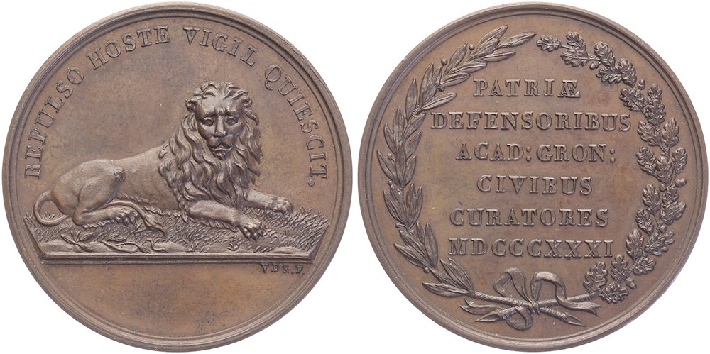 1831 Groningen. Tiendaagse veldtocht studenten. Liggende leeuw / Zesregelig opschrift binnen gestrikte lauwer- en eikentak. Æ 35. Dirks 450; JMP 1983, pag. 133/134, nr. 36. D. van der Kellen. Prachtig.