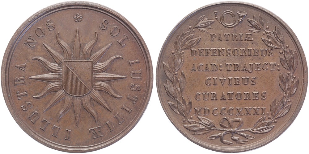 1831 Utrecht. Tiendaagse veldtocht studenten. Universiteitswapen. / Zesregelig opschrift onder jachthoorn binnen gestrikte eikentakken. Æ 35. Dirks 449; Hofstee 136. Prachtig.