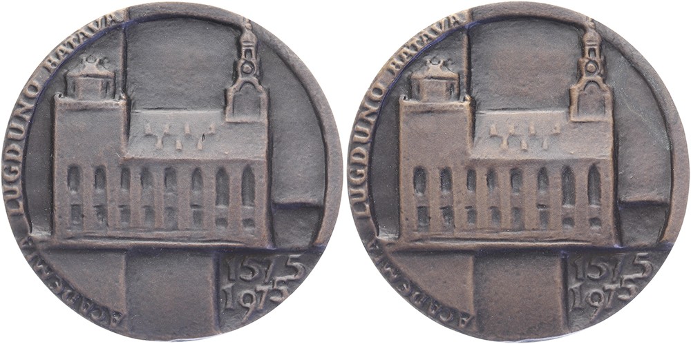 Lot (2) 1975 Leiden, 4e eeuwfeest universiteit. Gezicht op universiteitsgebouw. / Opschrift in kruisvorm. Æ 50. KB VII-3947; Hofstee 113. (Eric Claus). Prachtig.