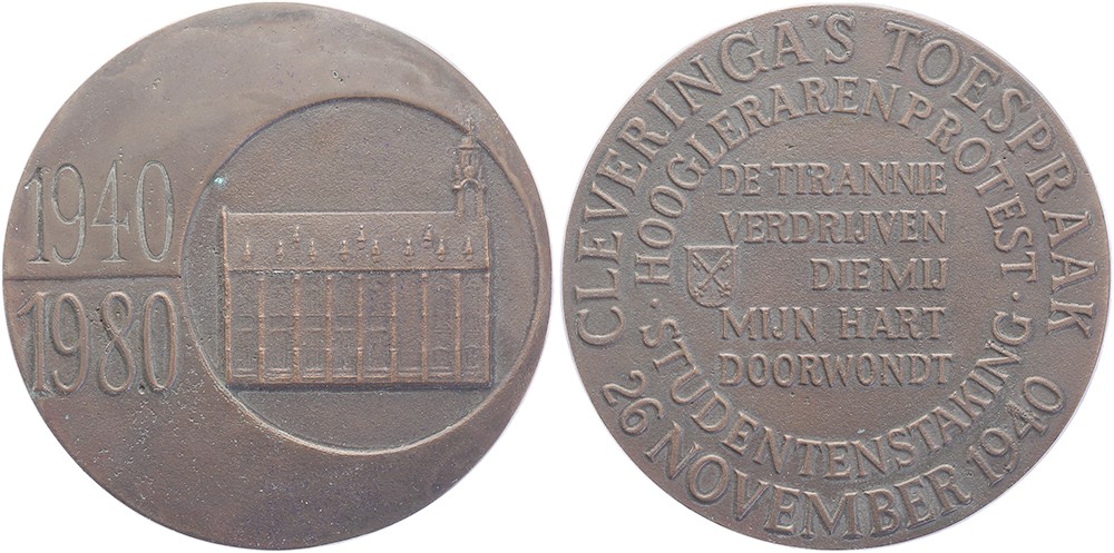 1980 Leiden, 40-jarige herdenking Cleveringa’s toespraak. Zijkant hoofdgebouw v.d. universiteit. / Op- en dubbel omschrift. Æ gegoten 82,2. (J.P.M. Sloos). Prachtig.
