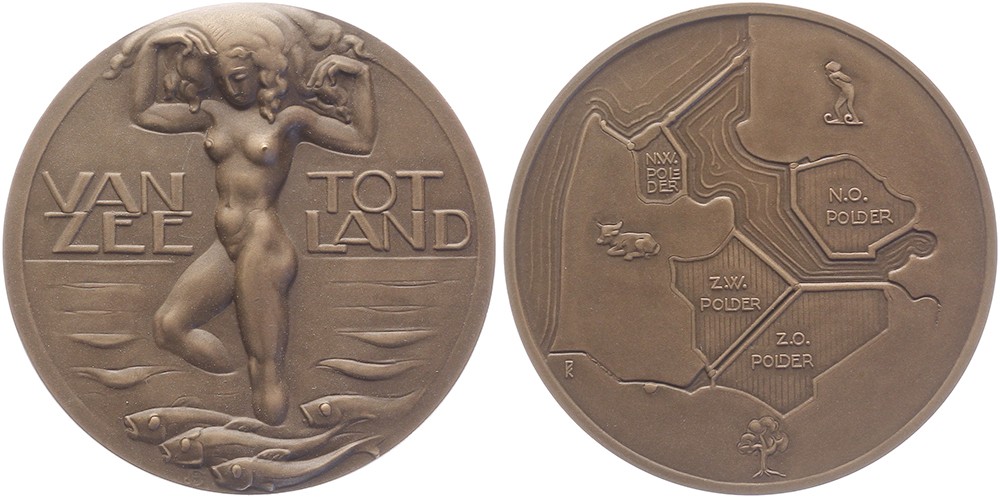 (1930) Droogmaking Zuiderzee. Naakte vrouw in water. / Plattegrond Zuiderzee. Æ60. KB III-451; Tilanus pag. 79-81. Gijs Jacobs van den Hof. Prachtig.