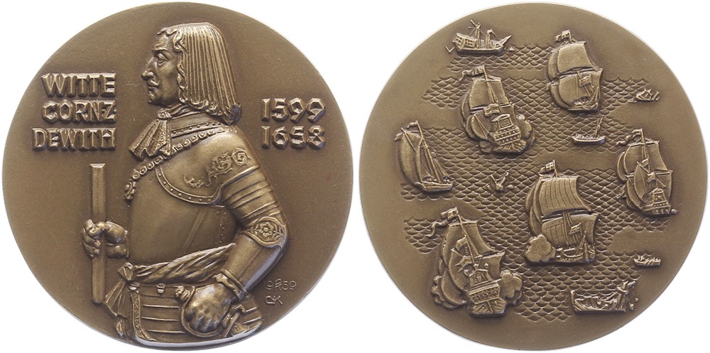 1958 Witte de With 1599-1658. De With in vice-admiraalsuniform. / Zeeslag. Æ 65. KB V-2510; Tilanus pag. 267-269. Cor van Kralingen. Prachtig.