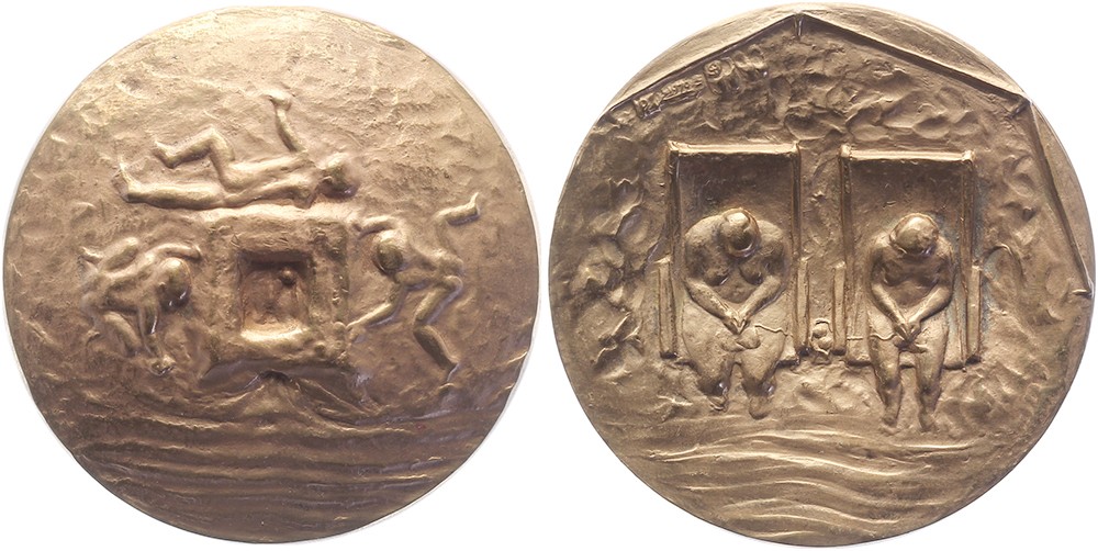 1976 Naaktstrand. Twee naakte vrouwen, van bovenaf gezien, aan het strand. / Drie naakte kinderen bouwen een zandfort. Æ gegoten 70 komvormig. Tilanus pag. 375-377. Guus Hellegers. Prachtig.