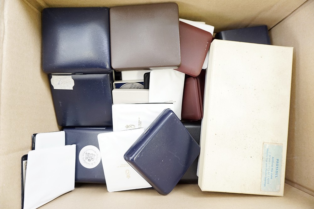 Grote doos afgeladen met penningen betr. het Oranjehuis, veelal in originele verpakking, brons en zilver (67).