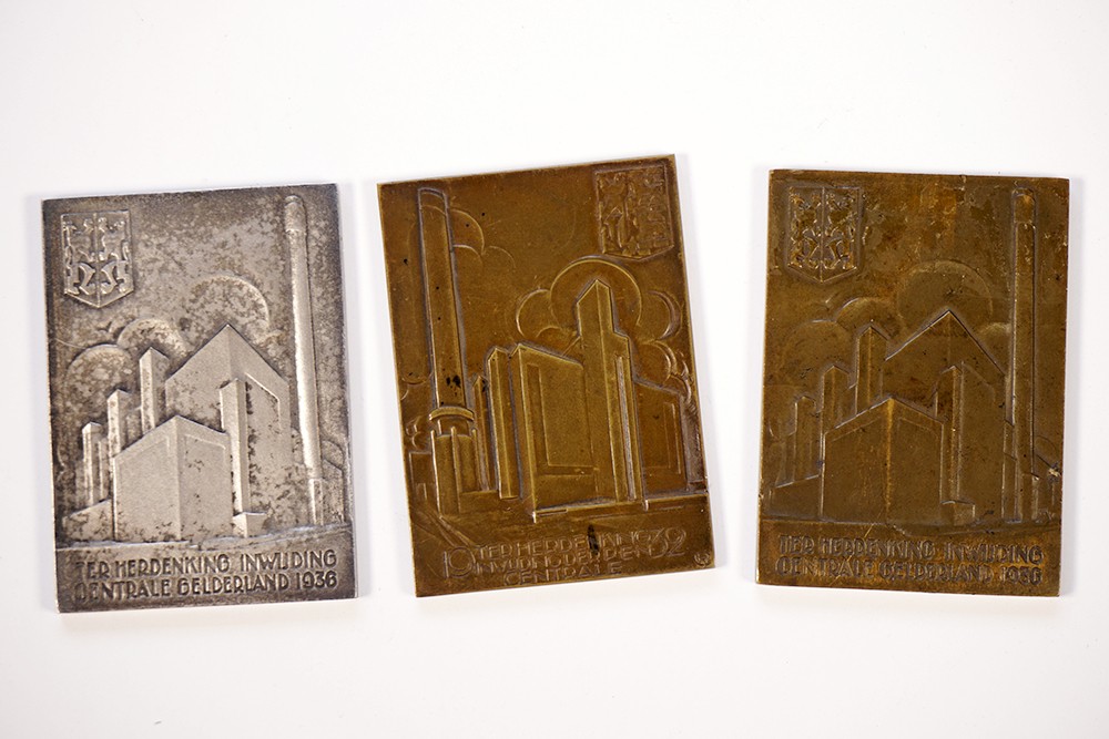 Lot (3)Plaquettes eveneens uit nagekomen inzending. 1932 Velzen Æ, 1936 Gelderland Æ door M. Kutterink a la van der Hoef en een zelfde exemplaar in zilver.