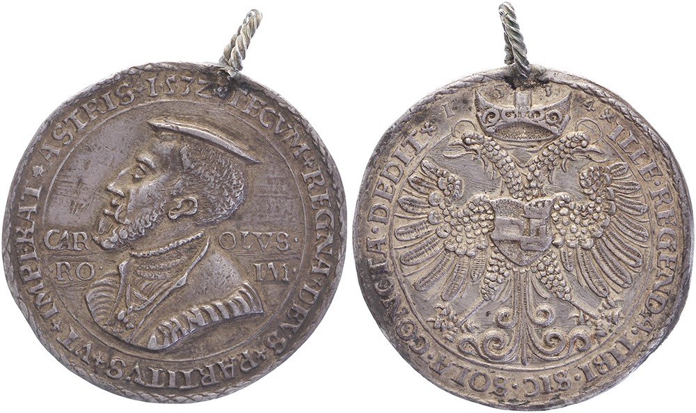 1532 Schautaler Kaiser Karl V (1519-1558) (Hall). Brustbild des Kaisers nach links mit Kurzem Haar. / Bekrönter Doppeladler mit tulpenförmigen Wappenbrustschild Österreich-Kastilien. AR 42,4 [18,57 g] mit Trageöse. Voglhuber 27. Sehr schön.