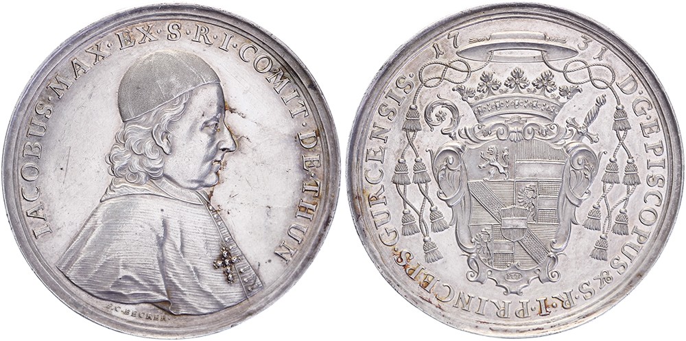 1731 Gurk (Bistum). Jacob Maximilian, Graf von Thun 1729-1741. Brustbild mit geistlichem Gewande und Kreuz auf der Brust nach rechts. / Wappen unter Bischofshut. AR 49,6 [34,85 g]. Philipp Christoph Becker. Appel Seite 230/231; Slg. Hohenkubin 253. Vorzüglich / Stempelglanz.