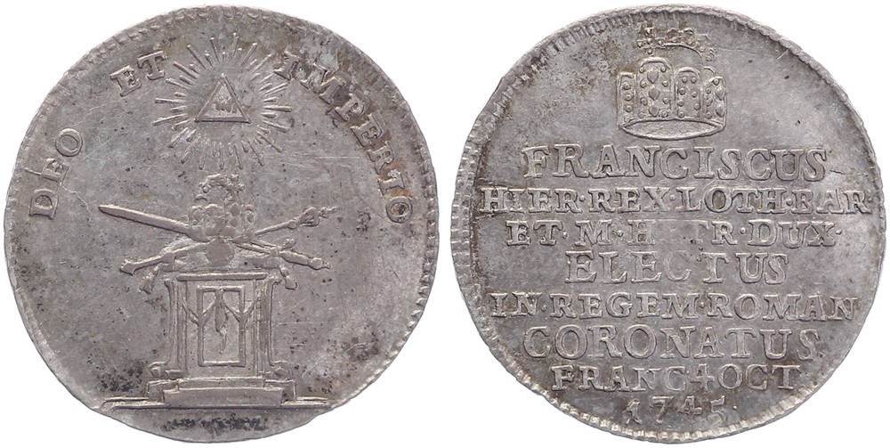 1745 Krönung Franz I. Altar mit Reichsinsignien, DEO ET IMPERIO / Acht Zeilen Schrift unter Krone. AR 21 [1,83 g]. Sehr schön / vorzüglich.