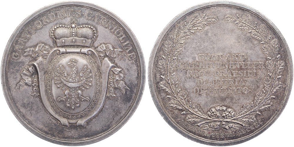 1790 Khevenhüller-Metsch, Johann Friedrich Anton 1776-1797, auf seine Ankunft in Laibach zur Eröffnung des krainischen Landtages. Wappen mit gekrönte krainische Adler. / Fünf Zeilen Schrift in Eichenlaubkranz. AR 48,7 [34,95 g]. Slg. Wellenheim 9965; Slg. Windischgrätz 715. Patina. Vorzüglich / Stempelglanz.