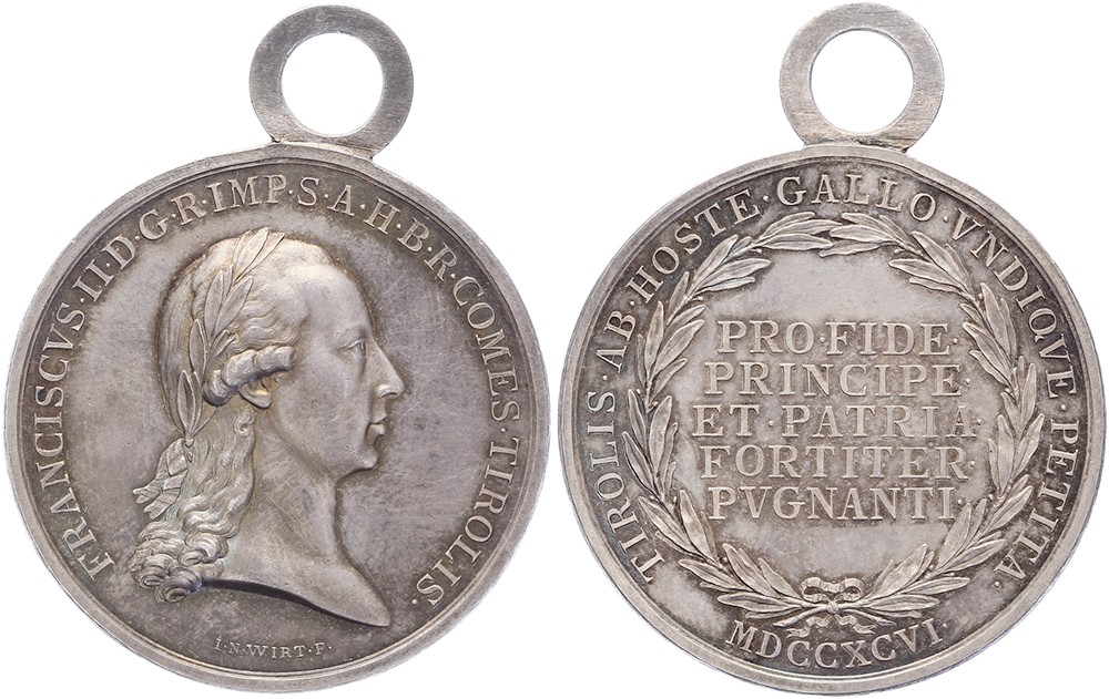 1796 Belohnungsmedaille Tiroler Kämpfer. Porträt Franz II. als Grafen von Tirol nach rechts. / Schrift: PRO FIDE PRINCIPE ET PATRIA FORTITER PVGNANTI AR 40,6 [17,59 g] mit Öse. Hennin 771. J.N. Wirt. Vorzüglich.