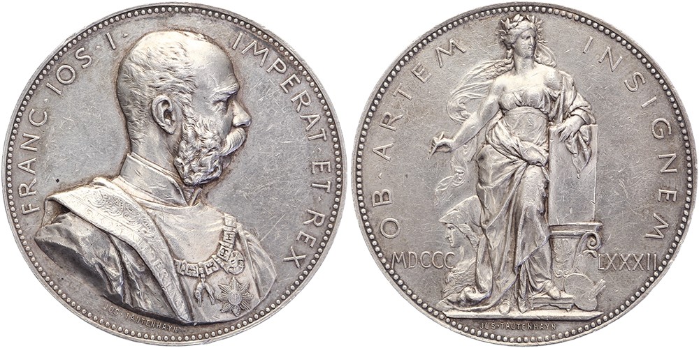 1882 Auf die Kunst. Brustbild Kaiser Franz Josef nach rechts. / Stehende Frau am Säule mit Minervakopf u.s.w., OB ARTEM INSIGNEM. AR 46 [39,27 g]. J. Tautenhayn. Randfehler. Sehr schön.