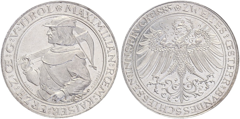 1885 Doppelgulden auf das 2. Österreichische Bundesschiessen in Innsbruck. Maximilian mit Kreuzbogen. / Adler. AR 36 [22,18 g]. Busson / Scharff. Stempelglanz.