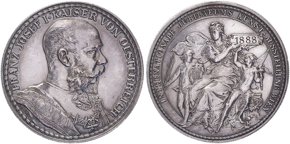 1888 Wien. Internationale Kunst-Ausstellung. Büste Franz Josef I. nach rechts. / Sitzende Ars umgeben von zwei Putti. AR 36,6 [24,96 g]. Slg Wurzbach 2518; Hauser 2916. A. Scharff. Vorzüglich.